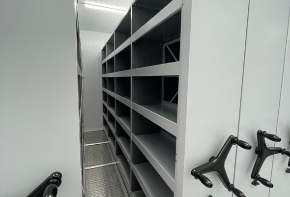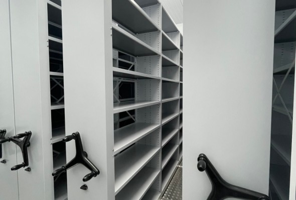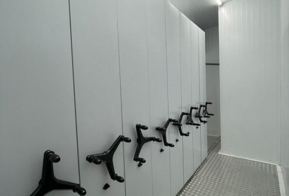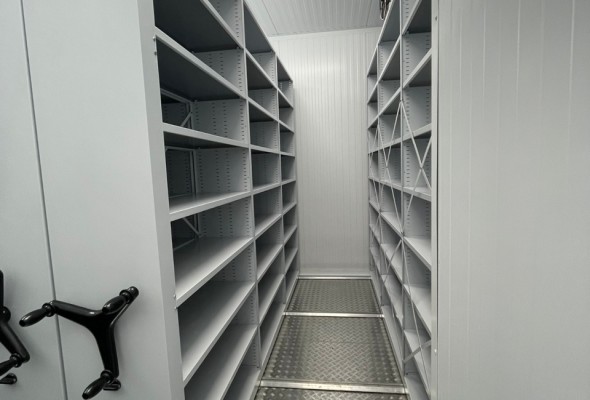 Так как помещение было большого размера, то мы поставили высокие и длинные мобильные стеллажи серии Т. Они имеют усиленную мобильную раму из металла, которая увеличивает их несущую способность. Расстояние между полками и количество полок внутри стеллажа было рассчитано таким образом, чтобы не было потери рабочей площади.