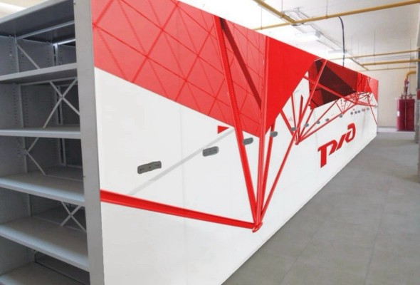 Изображения мы можем разместить как на отдельно стоящих стационарных стеллажах, так и на мобильных системах хранения, которые выстроены в единую линию. Это позволяет разместить элементы изображения так, чтобы они складывались в большую цельную картину, которая становится частью интерьера.