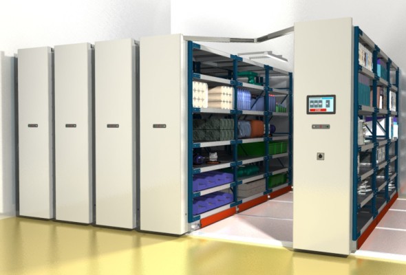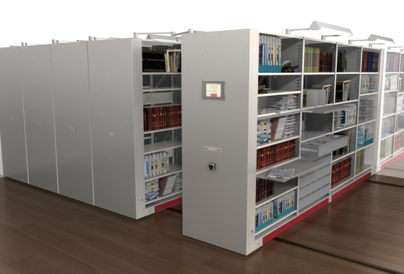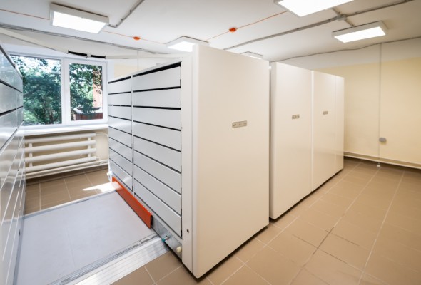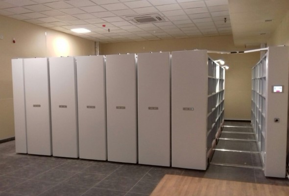 Применение мобильных стеллажей с электронным управлением позволяет не только увеличить в 2 раза вместимость хранимого, но и повысить эффективность работы с документами.